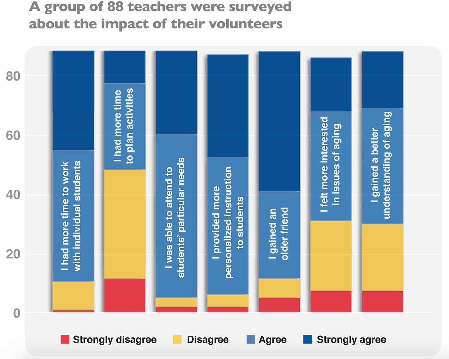 Our volunteers have helped students “catch up” to the rest of the class when they’ve fallen behind; provided extra challenges to advanced students to keep them engaged; and assisted students for whom English is a second language. In addition to the academic benefits, the one-on-one attention has helped students become more confident, exhibit better manners, and become more comfortable around other generations.